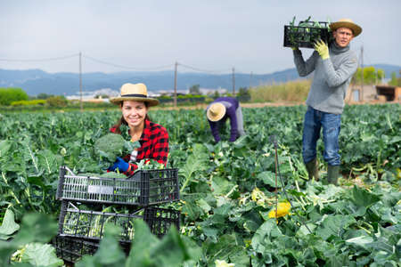 Woman farmer harvesting broccoli at a vegetable farm