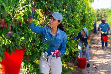 Asian workwoman harvesting ripe plums in farm fruit garden