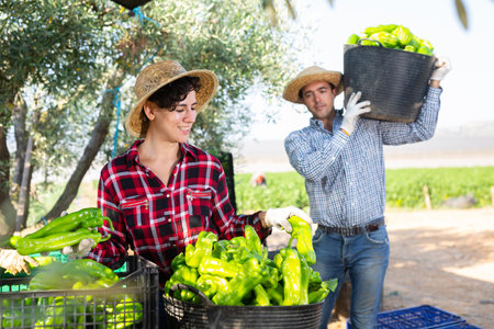 Team of farmers sorting green bell peppers in backyard of farm after harvest