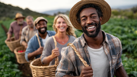 Portrait of happy farmer holding straw basket while standing with friends in field
