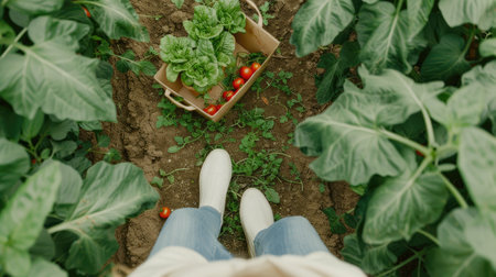 A person gathers ripe tomatoes in a woven basket from a lush garden during sunset, highlighting the beauty of fresh produce and rural life.