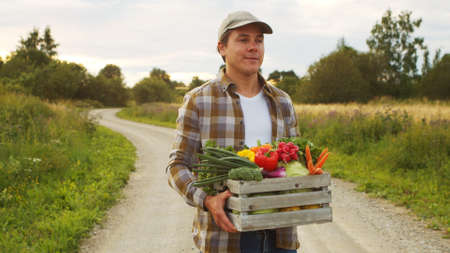 Farmer with a vegetable box in front of a sunset agricultural landscape. Man in a countryside field. Country life, food production, farming and country lifestyle.