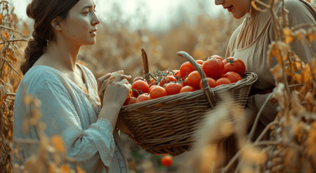 Two female farmers are happily holding baskets filled with fresh produce in a lush garden, surrounded by greenery and rustic buildings, celebrating their harvest