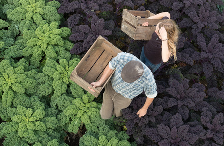 Overhead shot of two agricultural workers carrying empty wooden crates through a dense field of organic green and purple kale, planted in neat rows with large healthy leaves