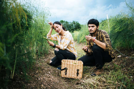 Young farmer couple harvest fresh asparagus with hand together put into the basket.