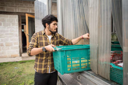 Young farmer harvest fresh asparagus with hand put into the basket.