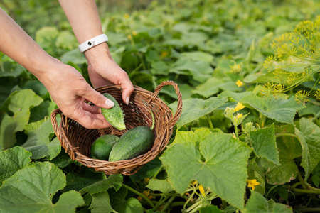 Harvesting cucumbers in the garden. The girl collects cucumbers in a wooden basket