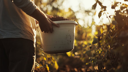 Close-up of a gardener holding a bucket with soil.