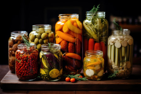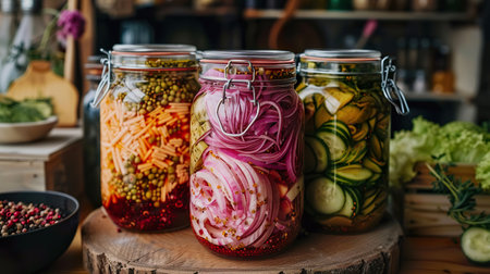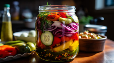Creative and Colorful Presentation of Diverse Pickled Vegetables in Glass Jars, Art of Preservation.