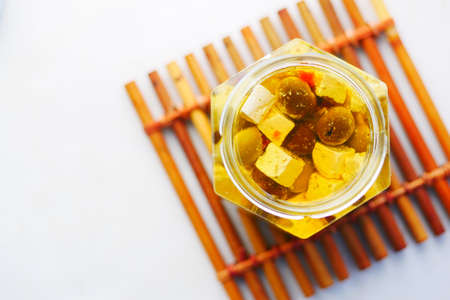 cheese cube , olive and herbs in a container on table