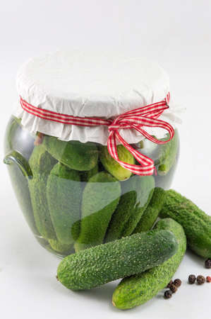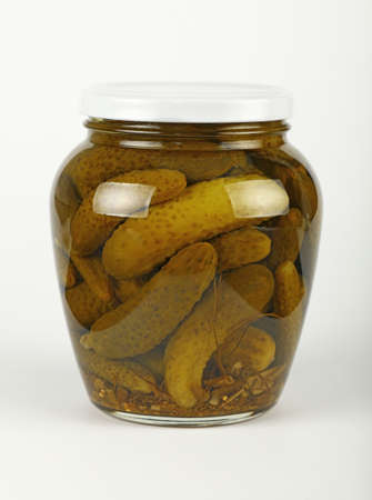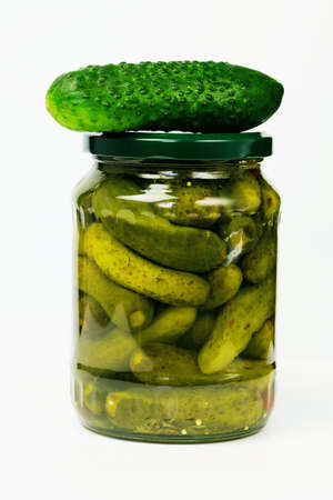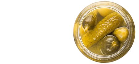 A jar of pickled cornichon gherkins, isolated on white background . Preservation of cucumbers for the future.