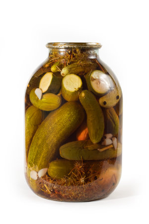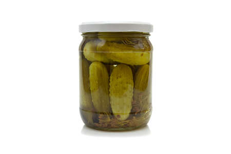 Jar of canned cucumbers isolated on white background. Pickled cucumbers in a glass jar
