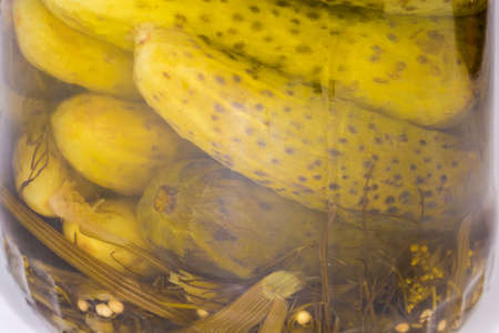 Canned cucumbers with spices in glass jar, view of fragment close-up through the glass and brine