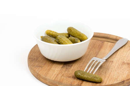 Pickled Cucumbers on Wood Plate Isolated. Fermented Food, Marinated Canned Vegetables, Gherkins, Pickled Cucumbers on White Background Top View