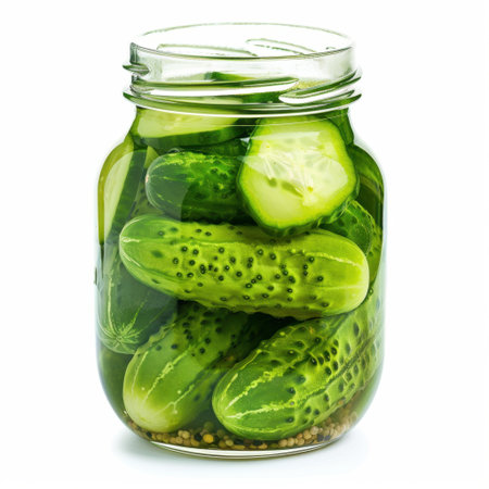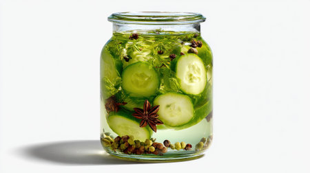 A visually appealing image of freshly pickled cucumbers in a clear glass jar, showcasing vibrant greens and aromatic herbs, ideal for culinary inspiration and healthy eating.