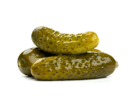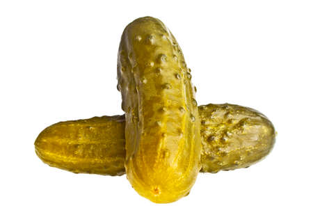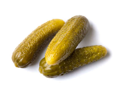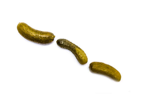 Three pickled cucumbers on white background