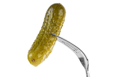 Fork with gherkin isolated on a white background. Pickled cucumber on fork.