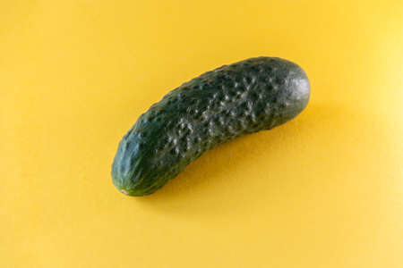 Ripe and beautiful green cucumber on a yellow background. Vegetarian food. close-up.