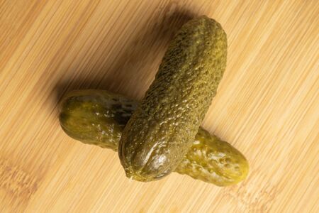 Group of two whole sour green pickle flatlay on light wood