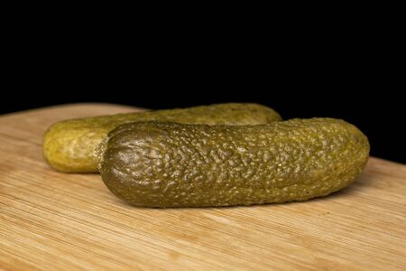 Group of two whole sour green pickle front focus on bamboo cutting board isolated on black glass