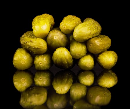 Group of seven whole sour green pickle isolated on black glass