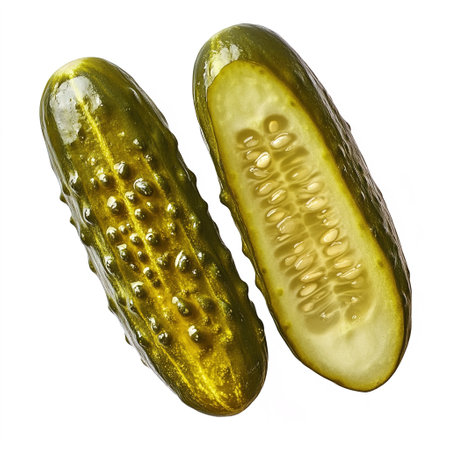 One pickled cucumber cut in half on white background.