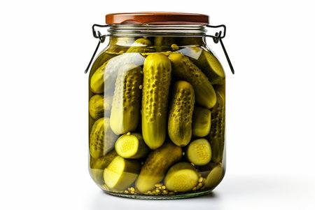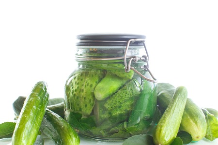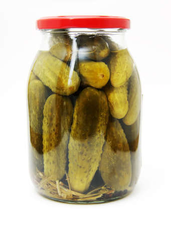 Pickles in a glass jar are isolated on a white background