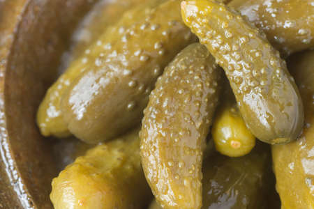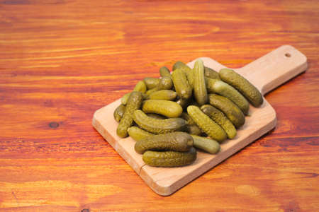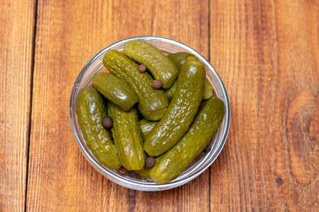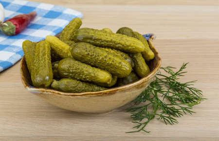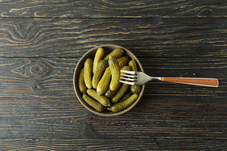 Pickled cucumbers gherkins on a wooden rustic table. Pickled cucumbers in a bowl