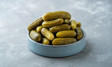 Small whole dill pickles, also known as gherkins, piled high in a light blue ceramic bowl. a classic fermented vegetable, perfect as a side dish or snack.