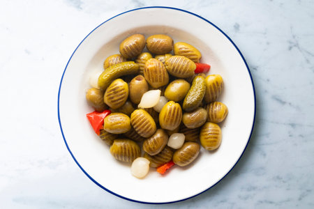 White plate with grilled olives, onions, peppers, and pickles. Overhead view of the table.