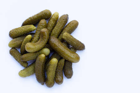 Pickled gherkins. Salted Cucumbers on a white concrete background