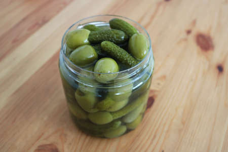 Small pickles. Marinated pickled cucumbers in jar on kitchen table.