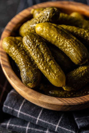 Small pickles. Marinated pickled cucumbers in wooden bowl on black table.