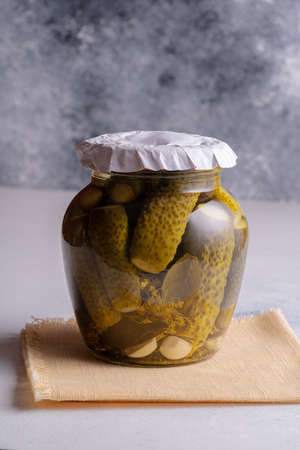 homemade canned cucumbers in big glass jar stand on kitchen table against gray wall background
