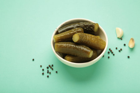 Pickled cucumbers in bowl on wooden rustic board. Top view