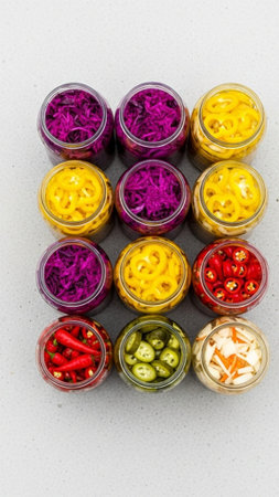 A vibrant shelf displaying glass jars filled with preserved vegetables such as peppers and pickles, creating a rustic and artisanal aesthetic.