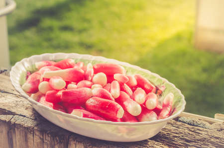 cleaned garden radish in a bowl/fresh garden radish in a garden on sunlight, selective focus