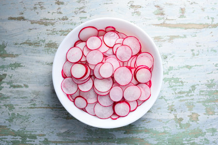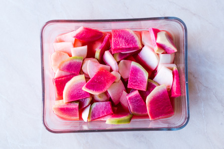 Fresh Radish Slices Glass Bowl. Organic Food