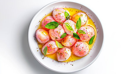 Delicate pistachio rosewater lou in white bowl with fresh basil garnish