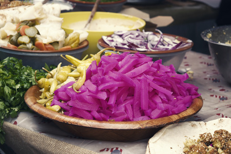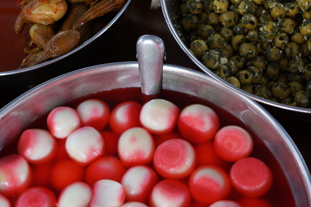 Red pickles close up on Eminonu square in Istanbul, Turkey.