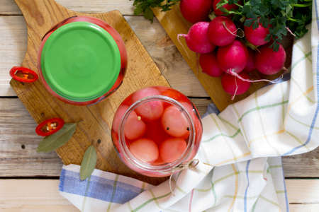 Sliced radish in a glass jar on a wooden table