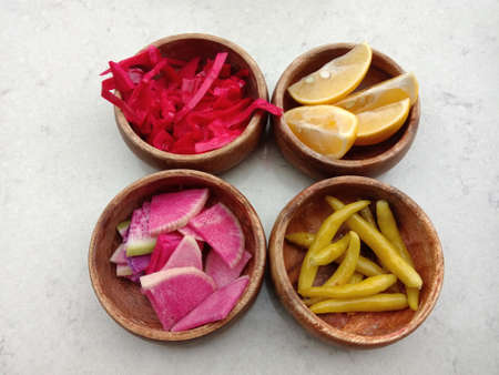 RED CABBAGE, LEMON, YELLOW CHILI PEPPER, RADISH shot together on table as preserves.