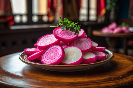 A plate of pink radish pickles