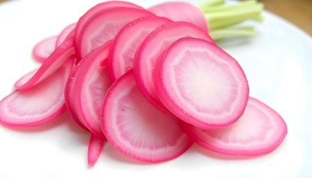 Fresh red radish slice in a macro close up, revealing its vibrant pink interior, intricate texture, and crisp, juicy appearance. healthy, organic vegetable detail.
