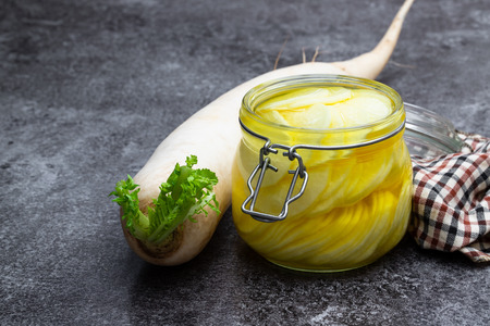 Marinated daikon in glass jar on gray table