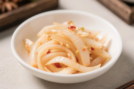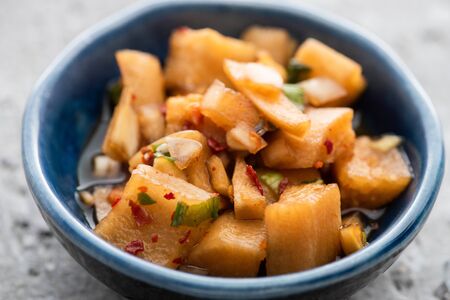 close up of tasty daikon radish kimchi in bowl