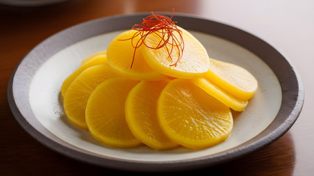 A neat arrangement of bright yellow sliced pickled radish, known as Danmuji or Takuan, served on a ceramic plate. The crisp slices are garnished with fine chili threads, presenting a traditional side dish common in Korean and Japanese cuisine.