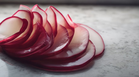 Close-up of beautifully sliced radishes arranged on a marble surface, showcasing their vibrant color and smooth texture, ideal for culinary presentations.