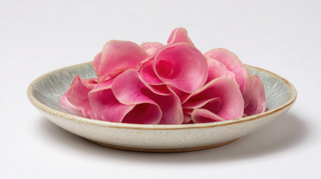 Pink radish slices elegantly presented in a ceramic bowl.