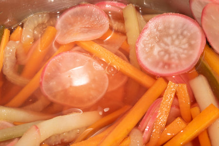 Close up of pickled vegetables including chopped carrot radish cucumber